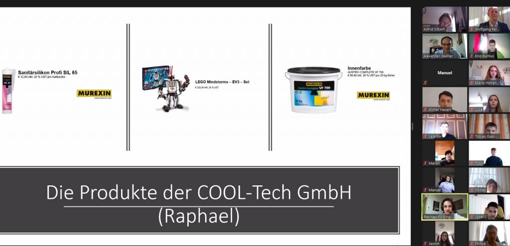 Alle drei Jahre unterziehen wir uns einer Re-Zertifizierung durch das COOL-Impulszentrum. In diesem Jahr wurde die Re-Zertifizierung von der 1BK Industrial Business HAK und Prof. Wallner in Zusammenarbeit mit Frau Prof. Astrid Silbert von der BHAK Wien 10 durchgeführt – natürlich digital im Rahmen einer ZOOM-Konferenz. Im Zentrum dieser Veranstaltung stand eine Präsentation der Schüler über den Unterricht in der 1BK. Die Schüler berichteten vor allem über unsere Businessweeks, ihre Lernfirma, die COOL-Tech GmbH, ihren Klassenpaten, die Murexin GmbH, und ihre Erfahrungen aus dem Distance-Learning.