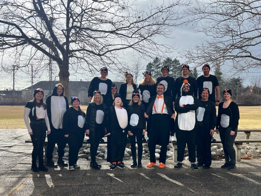 Als Pinguine watschelte das Kollegium durch das Schulhaus und sorgte damit bei Schülerinnen und Schülern für viele schmunzelnde Momente und eine besonders fröhliche Stimmung.