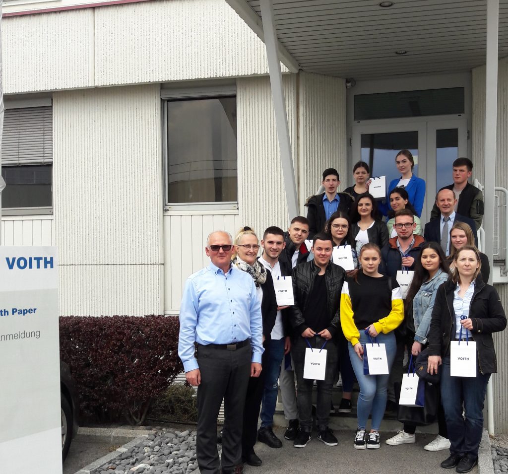 Geschäftsführer Alexander Reutlinger (Voith), Personalreferentin Sabine Machacek (Voith), 4 BK HAK in Begleitung von