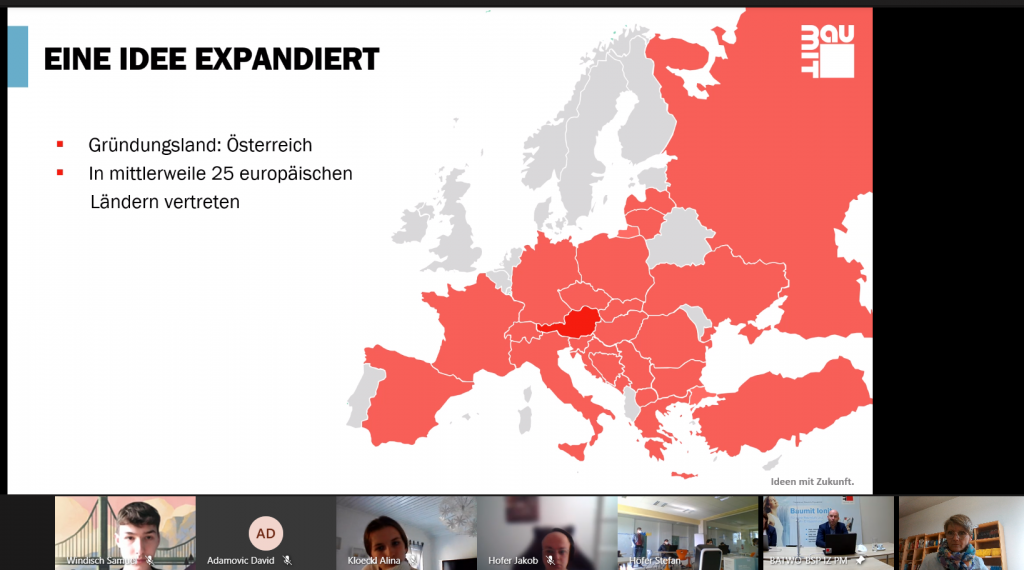 Roman Stickler und seine Stellvertreterin Christa Berger übernahmen diese Aufgabe gerne: In einer Videokonferenz im Rahmen einer Unterrichtsstunde des Gegenstands “Management für Industrial Business” stellten die beiden die Marketingstrategie von Baumit Österreich vor. Ein Teil der Klasse nahm in der Schule gemeinsam an der Videokonferenz teil, die restlichen SchülerInnen loggten sich von zu Hause aus ein.