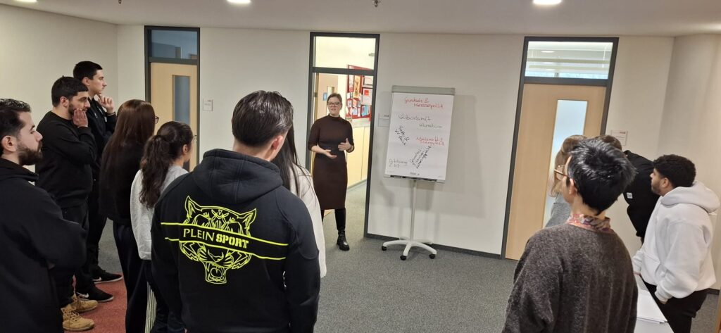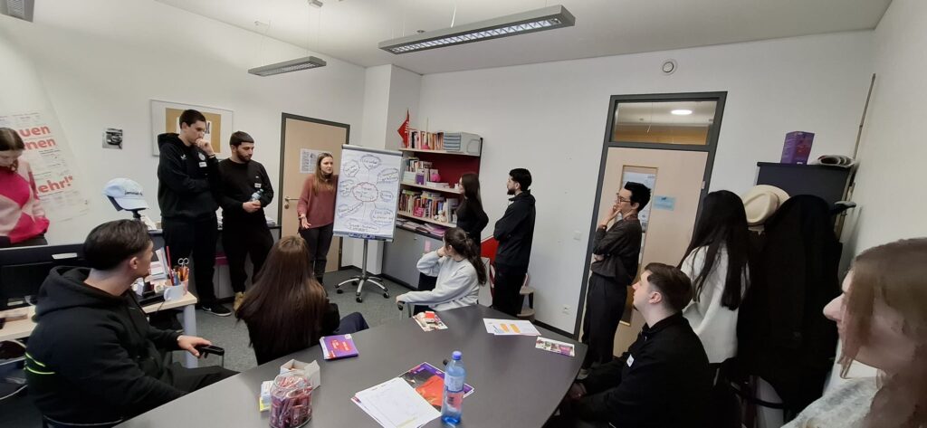 Nach einer kurzen Pause folgte ein Rundgang durch das Gebäude des ÖGB. Besonders interessant war das Kennenlernen der ÖGB-Jugend, die sich gezielt für die Anliegen junger Arbeitnehmer:innen und Lehrlinge engagiert. In der Abteilung Sozialpolitik traf die Klasse außerdem auf eine ehemalige Absolventin der HAK Neunkirchen, die Einblicke in ihre Arbeit gab. Ein weiterer Programmpunkt war ein Gespräch mit einer Mitarbeiterin zum Thema „Frauen machen Zukunft“, bei dem die Bedeutung von Gleichstellung und Chancengerechtigkeit in der Arbeitswelt thematisiert wurde.
