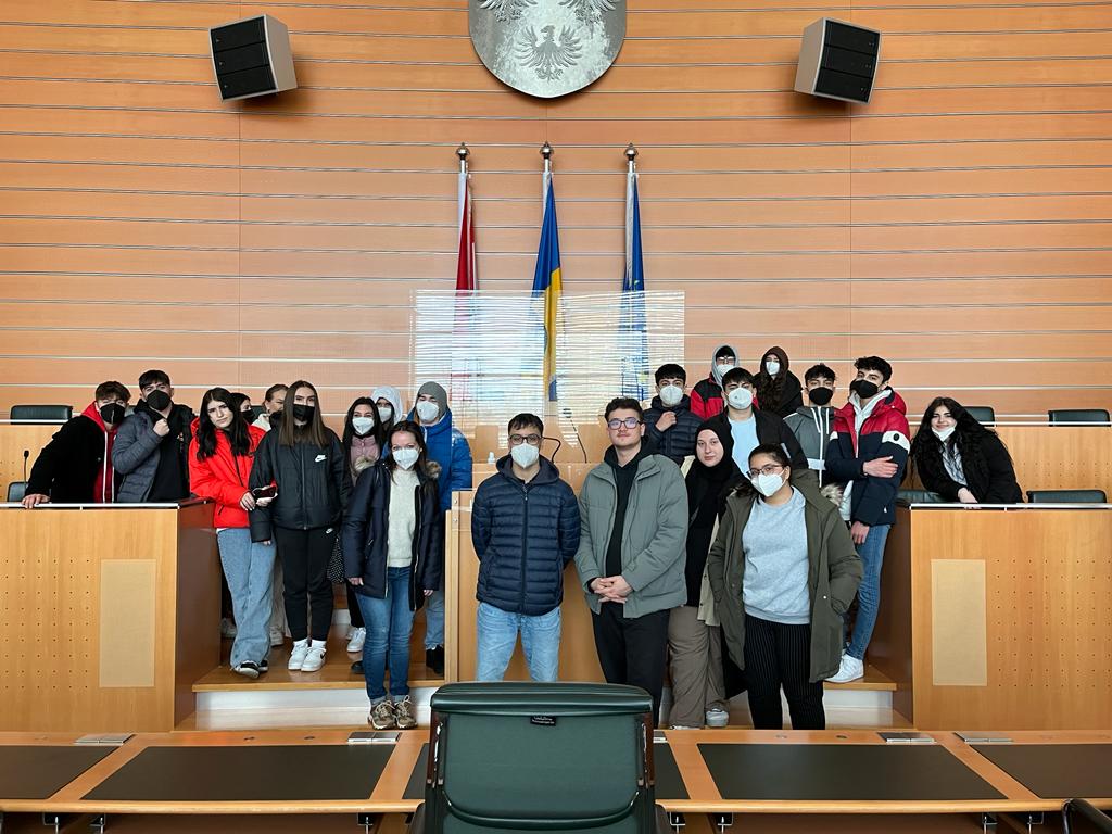 Am Bahnhof St. Pölten wurden wir von unserem Tourguide Susanne empfangen, welche mit uns sogleich zur HTL St. Pölten marschierte. Dort durften sich die Schülerinnen und Schüler ein Lunchpaket zur Wegzehrung aussuchen. Gestärkt, ging es bei eisigen Temperaturen weiter in Richtung St. Pöltner Altstadt, wo wir gespannt Geschichten rund um historisch wichtige Sehenswürdigkeiten lauschten. So erfuhren wir vom Heiligen Hippolyt, nach dem St. Pölten zwar benannt ist, der aber gar nicht dort war. Außerdem überprüften wir die Anzahl der Teller an der Außenfassade des berühmten Tellerhauses. Besonders interessant war auch ein- und dieselbe Gasse, welche im Laufe der Zeit viele verschiedene Namen trug. Selbstverständlich besuchten wir auch das Wahrzeichen der niederösterreichischen Landeshauptstadt, das Rathaus und die unmittelbar davor befindliche Dreifaltigkeitssäule. Ein Besuch im Dom sowie bei den „Tratschenden Frauen“ am Herrenplatz rundeten unseren Ausflug ab. Die 1as hatte dazu die Möglichkeit den Klangturm zu besteigen (inoffizielles Wahrzeichen von St. Pölten) und den großartigen Ausblick auf St. Pölten genießen. Ein besonderes Highlight bildete den Abschluss: der Besuch im Landhaus. Darin durften die Schülerinnen und Schüler sogar auf den Plätzen im Landtagssaal Platz nehmen! Bevor wir am Nachmittag wieder in den Zug Richtung Neunkirchen einstiegen, ging sich auch noch ein schneller Kurzbesuch bei McDonald’s aus.